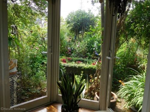 朝の庭を眺めていたら、前方に動くものが。 ヒマワリの種をとろうとしている四十雀でした。 昨日の夕方も家族らしい5〜6羽の集団が訪れていました。 あわててカメラをとりに。 その間にどこかへ飛び去りました。 と思ったら、部屋の前のシェイクスピアコーナ…