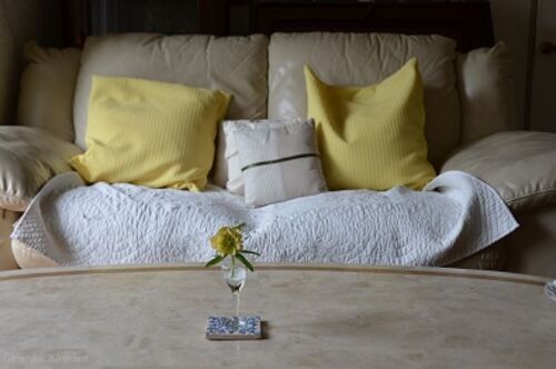 窓辺の丸テーブルの右側にあった段々式の大きな書類入れを移動して、見えていなかった鏡があらわれた。テーブルを鏡の所まで寄せて、テーブルクロスは洗濯して清潔にしてから上に春らしいクロス。 「広々と見えるわね。外も良く見えるでしょう!」 テーブル…