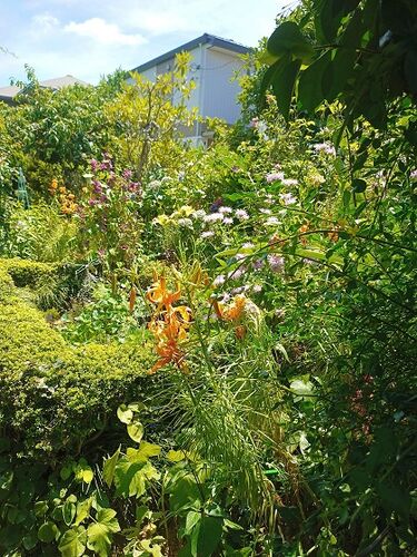 アンジェラが咲いてきました。 小径、手前は百合の蕾、ハタザオキキョウの曲がり角の向こうでは・・・ ムーレインが咲き出した。 Mさんにいただいたギボウシを鉢に植えなおした。美しく珍しいギボウシうれしいこと。