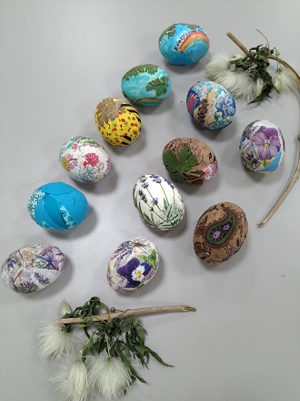 家で中身を出してきれいに洗い干したものを持ってきていただき、私がお持ちした材料を貼り付けていただきました。