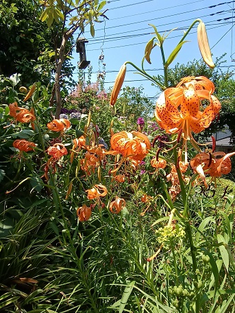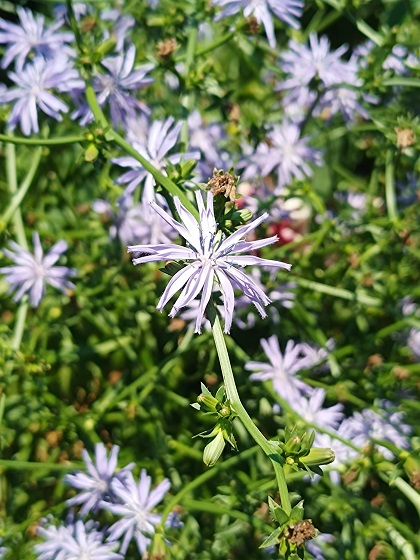 ポタジェのチコリ`カタルーナ'が涼し気な色の花。