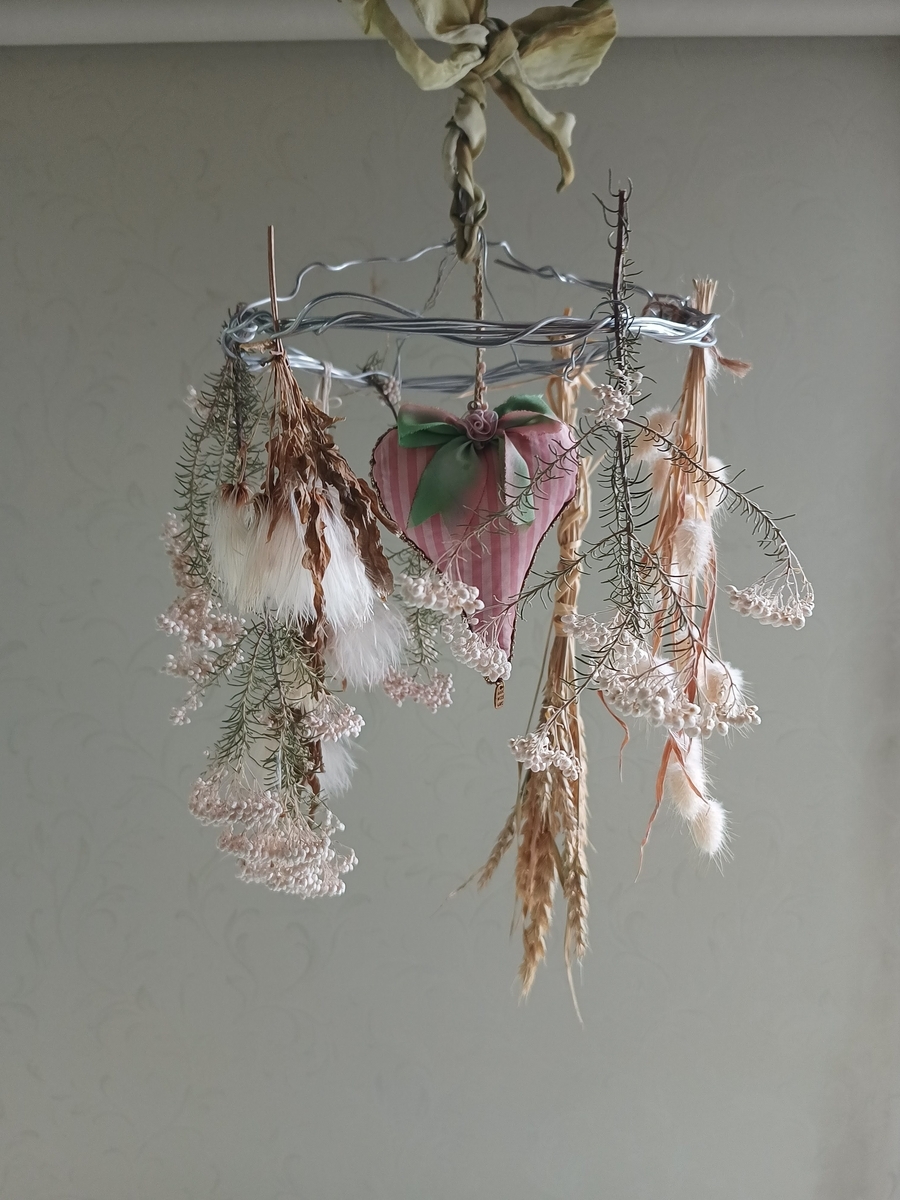 春に花友Mさんからいただいた、ライスフラワー、ラグラス、我が家のものは小麦とウインタークレマチス。
