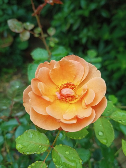 昨日蕾だったバラの`パットオースチン'が今朝ぱっちりと咲いていました。