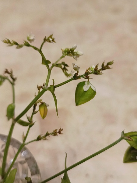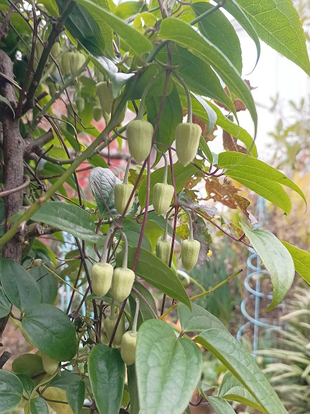 カボスの木の手前の多年草のシャクチリソバの愛らしい白花の後に実がなり始めました。