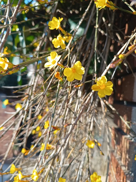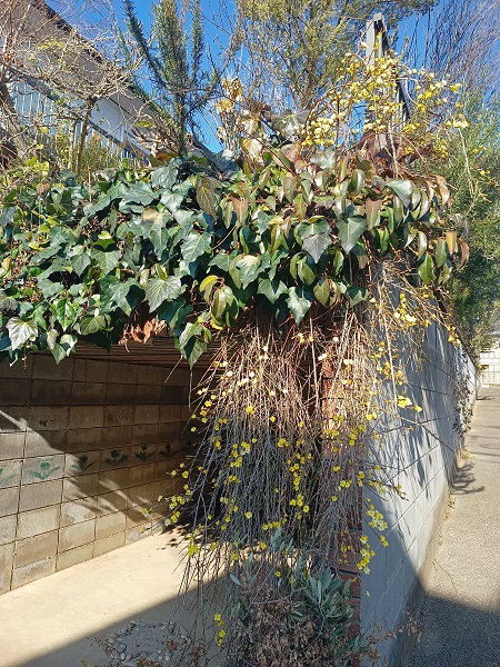 車庫の上から垂らして育てている黄梅は、夫が少年時代に住んでいた家の崖の斜面に春になると見事に咲いていたという話を聞いて、ある日花屋でこの苗を見つけて購入、この場所に植えました。居心地よいらしくイメージ通りに繁茂してきました。