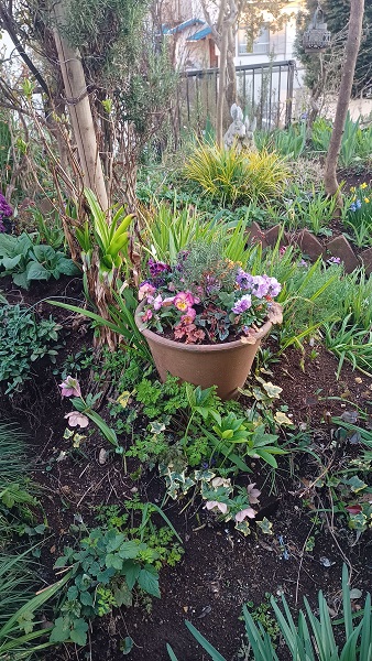 春らしく次々と咲き進む花の寄せ植え。