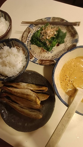 コマイの干物とポタジェで摘みたての小松菜のお浸しを添えて。