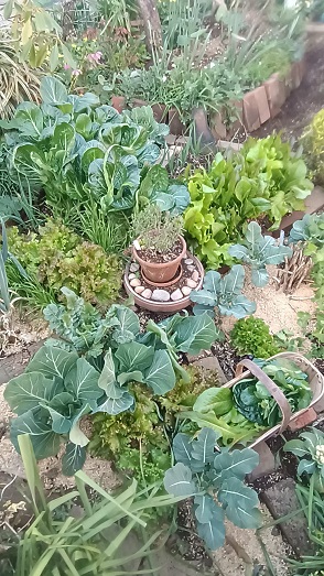 ポタジェがとてもきれいです。夕方、夕食のお浸しの小松菜と、明日の朝食のレタスいろいろを摘み採りました。自分で育てた野菜を料理する、幸せな気持ちです。
