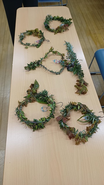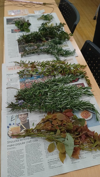 その次は、我が家からお持ちしたハーブいろいろを使用して、小さくて可愛いリースを作っていただきました。