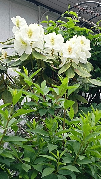 ホワイトガーデンの奥に植えているシャクナゲの白花`フィリィスコーンが咲き出した。昨年はあまり咲かなかったので、うれしいこと。