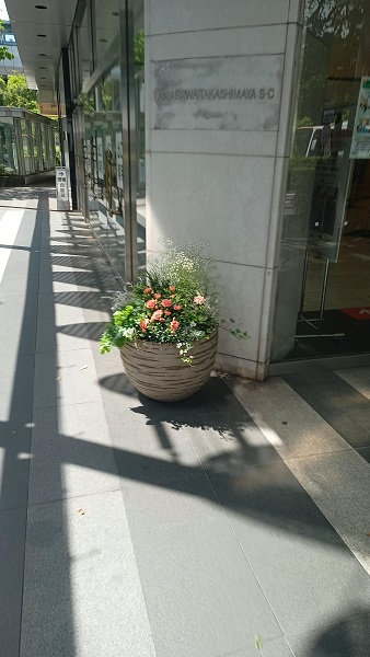 高島屋の入口。やさしい色合いのカーネーションなどの寄せ植え。