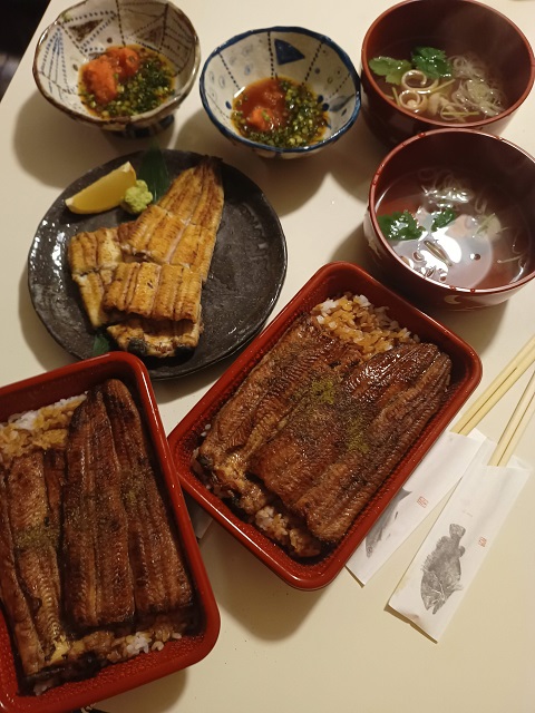 (本日の夕飯は花友Mさんにいただいた鰻弁当とウナギの白焼き)