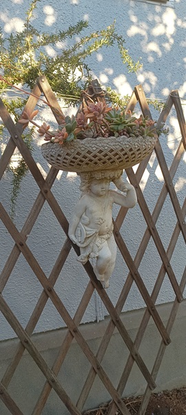バラクライングリッシュガーデンに出かけた時、一目ぼれで購入した鉢。ホワイトガーデンのアーチの先に設置していたが、写真撮りするとお隣の家のフェンスがあったりで気に入らず、今日ふと思いついてこの場所に移動してみた。ここだったら公道からも良く見えるし、シンプルな背景が私好み。
