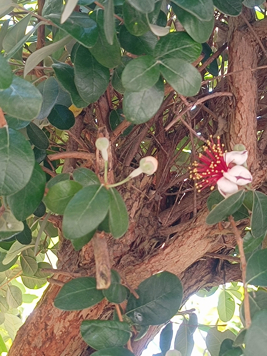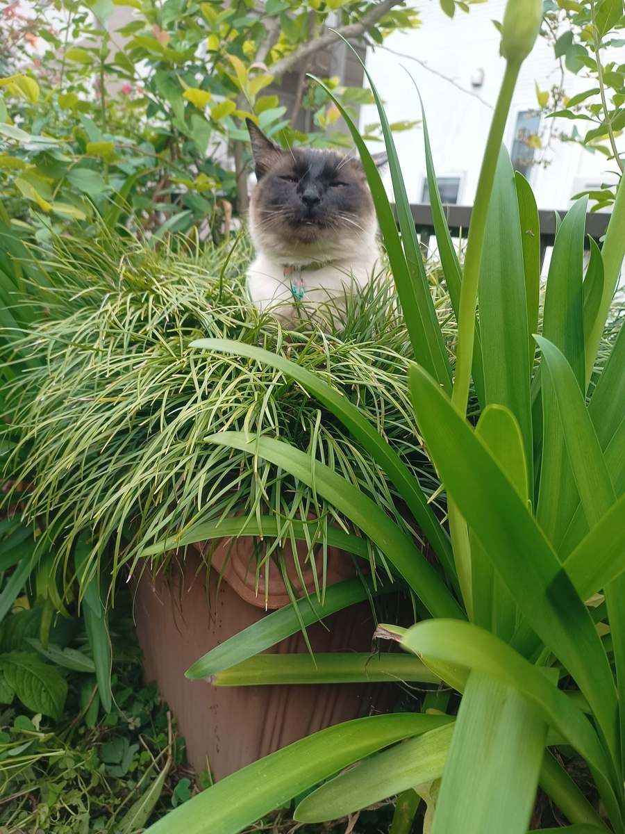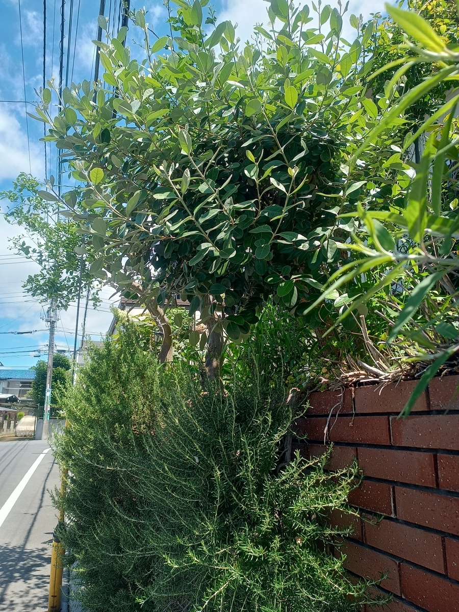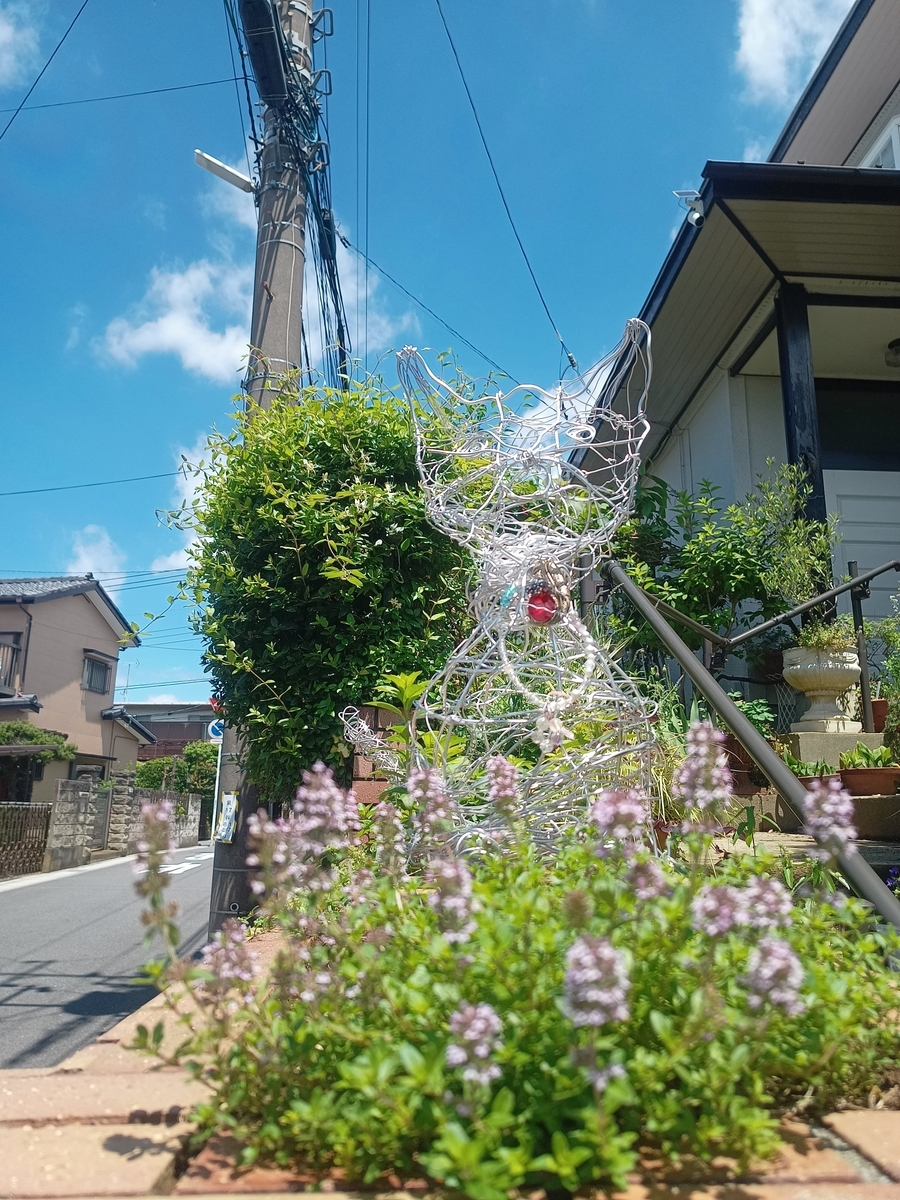 2025-06-01 6月1日 爽やかな青空に白い雲、久しぶりのお天気がうれしい一日でした。 ワイヤクラフトのニャンの足元に植えたクリーピングタイムが、気に入ってくれたようで沢山の花。うれしいです。 ニャンの向こうには生きているリース。剪定して形を整えました。 その向こうの茂ったフェイジョアを下から覗くと、あらうれしいこと、花が咲いていました。 下がローズマリーで上がフェイジョアです。 南側の大鉢にミズが寛いでいました。この辺りもドクダミなどいらないものを抜いたりバラの花がら摘みで忙しくも達成感のある日々です。
