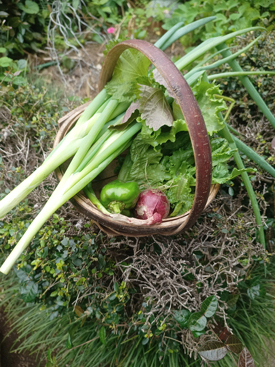 ポタジェの収穫。ムラサキタマネギとピーマンが初収穫。