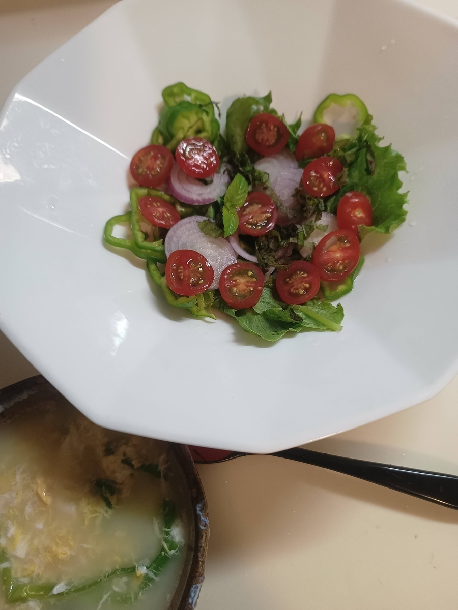 ネギの入った卵スープとミニトマトをプラスして収穫の喜びのサラダ。ゴマドレッシングでいただきました。ごちそうさまでした。
