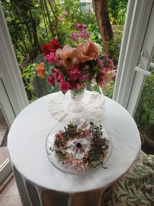 窓辺のモイストポプリはシックな色合いに変化しました。バラ色々は良く咲いています。毎日水を替えますがよく吸っています。